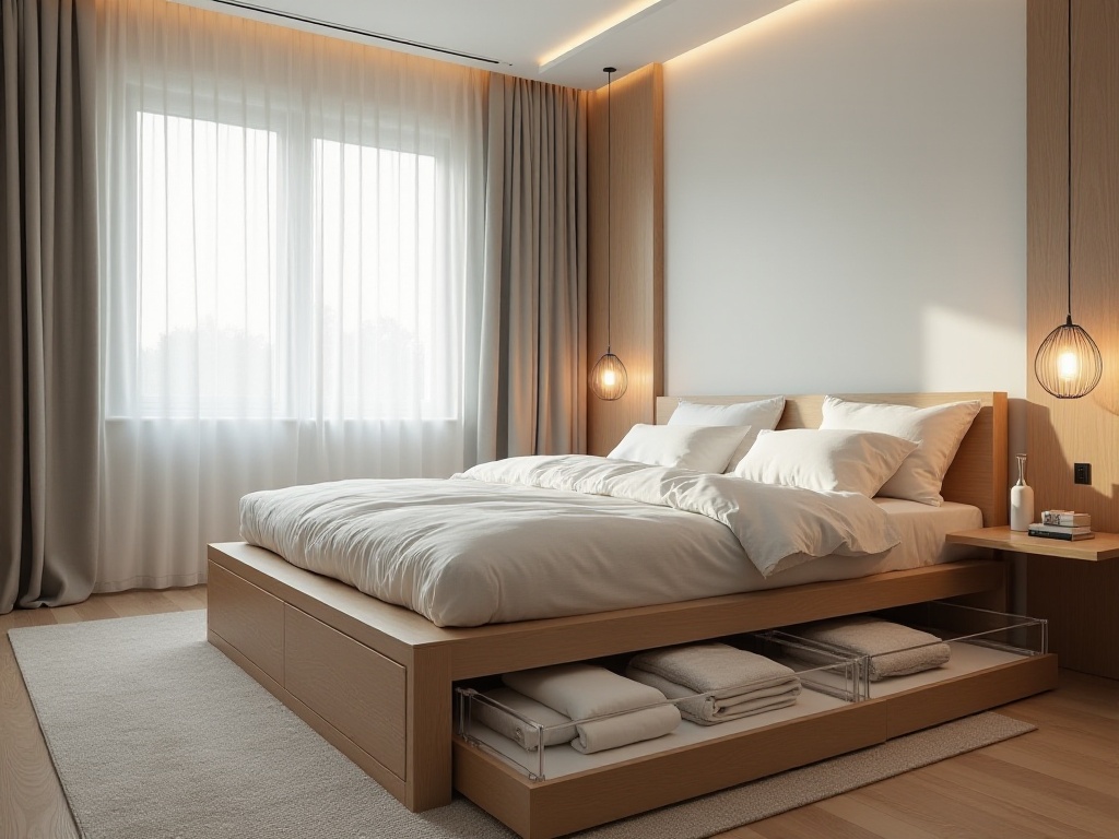 Have you ever thought about how the space under your bed can be well utilized? This idea not only saves space but also makes your life more organized. You can use flat storage boxes or drawers with wheels to store clothes you don't often use or extra bedding. This not only makes your space look neater but also allows you to easily find these items when needed.